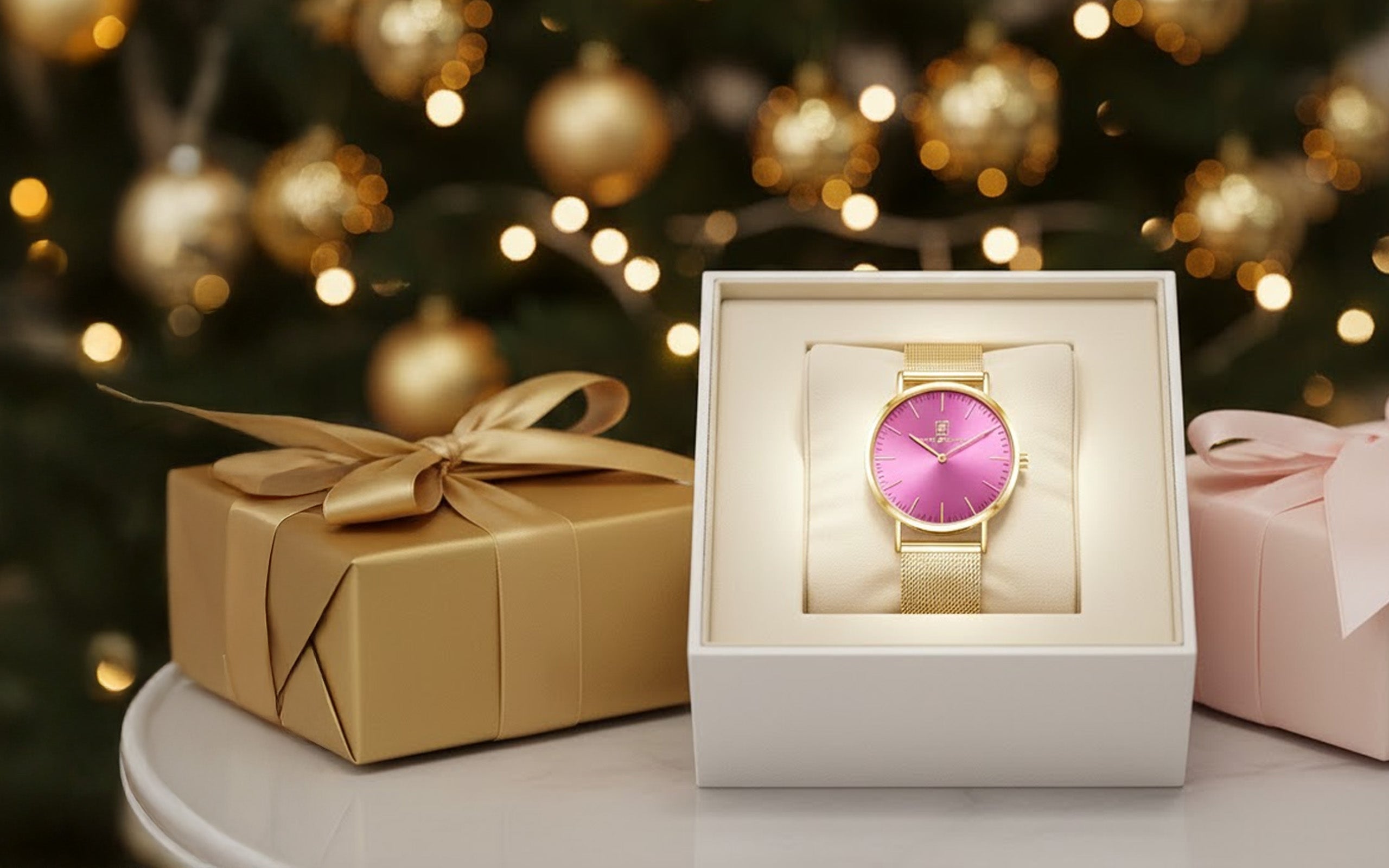 Neue Farbe- neues Du! Damenuhr Gold- Armband aus Milanese mit pinkem Ziffernblatt “Leipzig” 32 mm