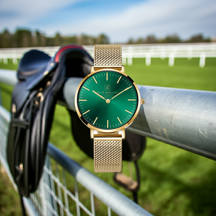 stilvolle Damenuhr in Gold mit Milanese Armband und grünem Ziffernblatt