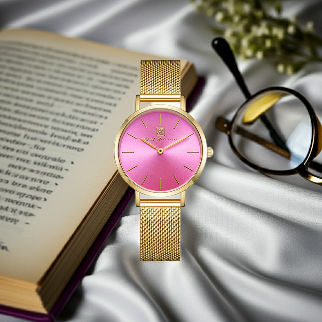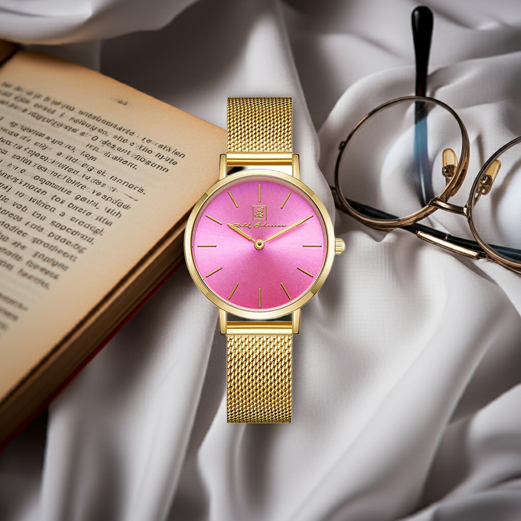 Die Damenuhr in Gold mit Milanese Armband und pinkem Ziffernblatt “Leipzig” vereint zeitlose Eleganz mit einem Hauch von Modernität. Ihr goldenes Milanese Armband strahlt Luxus und Raffinesse aus, während das pinke Ziffernblatt einen frischen, modischen Akzent setzt. Die goldenen Zeiger und stilvollen Markierungen fügen sich harmonisch ins Design ein und machen diese Uhr zu einem perfekten Begleiter für jeden Anlass. Das feine Milanese Armband passt sich angenehm Ihrem Handgelenk an und sorgt für maximalen Tragekomfort. Kombiniert mit dem auffälligen pinken Ziffernblatt wird die Uhr zum stilvollen Blickfang, der Ihre Persönlichkeit unterstreicht. Die Damenuhr in Gold mit Milanese Armband und pinkem Ziffernblatt “Leipzig” ist ein Statement für Frauen, die klassische Eleganz mit einem Hauch von Farbe lieben.