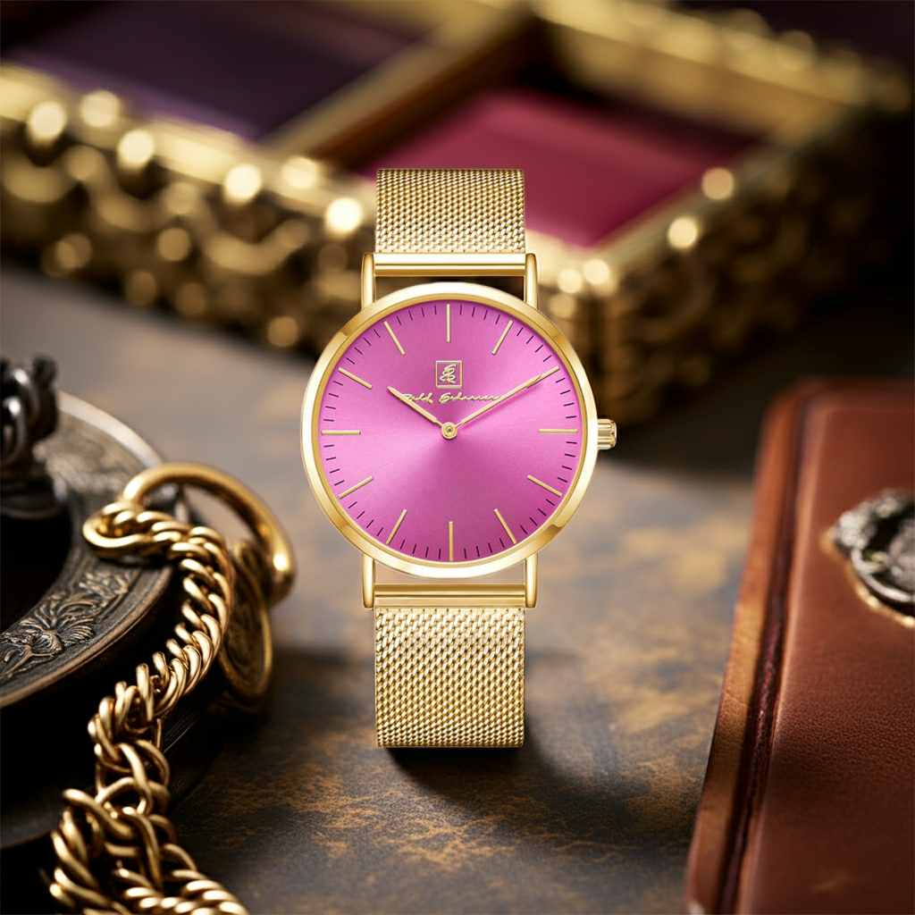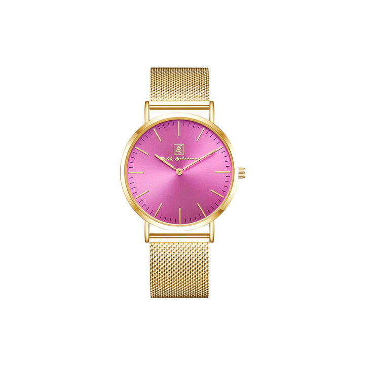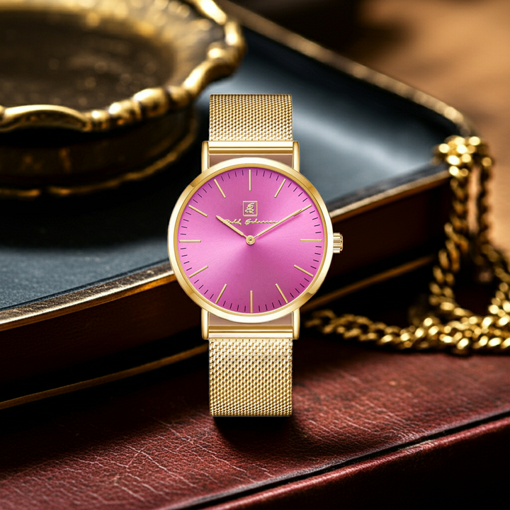 Diese stilvolle Damenuhr Pink/ Gold “Wiesbaden”, bietet nicht nur ein edles Design, sondern auch hohen Tragekomfort. Das praktische Quick-Release Armband an der Damenuhr Pink/ Gold “Wiesbaden” ermöglicht ein einfaches Wechseln, sodass du die Damenuhr Pink/ Gold “Wiesbaden” schnell Ihrem Stil anpassen können. Die Kombination aus einem schlichten, nur 6 mm flachen Gehäuse und einer Breite von 40 mm macht diese Damenuhr Pink/ Gold “Wiesbaden” zu einem zeitlosen Accessoire. Egal ob zu formellen Anlässen oder in der Freizeit, mit dieser eleganten Damenuhr Pink/ Gold “Wiesbaden” setzt du immer ein modisches Statement.