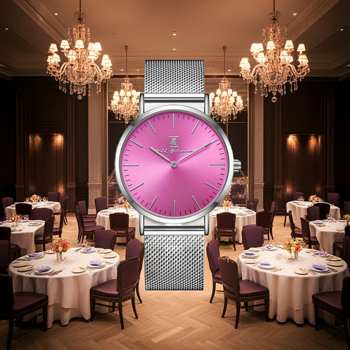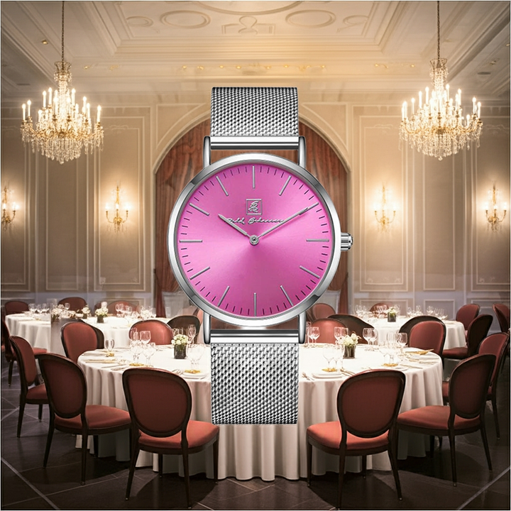 Neben ihrem auffälligen Design überzeugt die Damenuhr in Silber mit Milanesearmband und pinkem Ziffernblatt “Mainz” durch hohen Tragekomfort. Das hochwertige Milaneseband passt sich sanft dem Handgelenk an und bietet einen sicheren Halt, ohne auf Komfort zu verzichten. Der flexible Verschluss sorgt dafür, dass sich die Uhr individuell anpassen lässt und angenehm zu tragen ist. Das pinke Ziffernblatt schafft einen auffälligen Kontrast zum silbernen Gehäuse und sorgt für eine lebendige und frische Optik. So sorgt die Damenuhr in Silber mit Milanesearmband und pinkem Ziffernblatt “Mainz” jeden Tag für einen farbenfrohen Akzent.