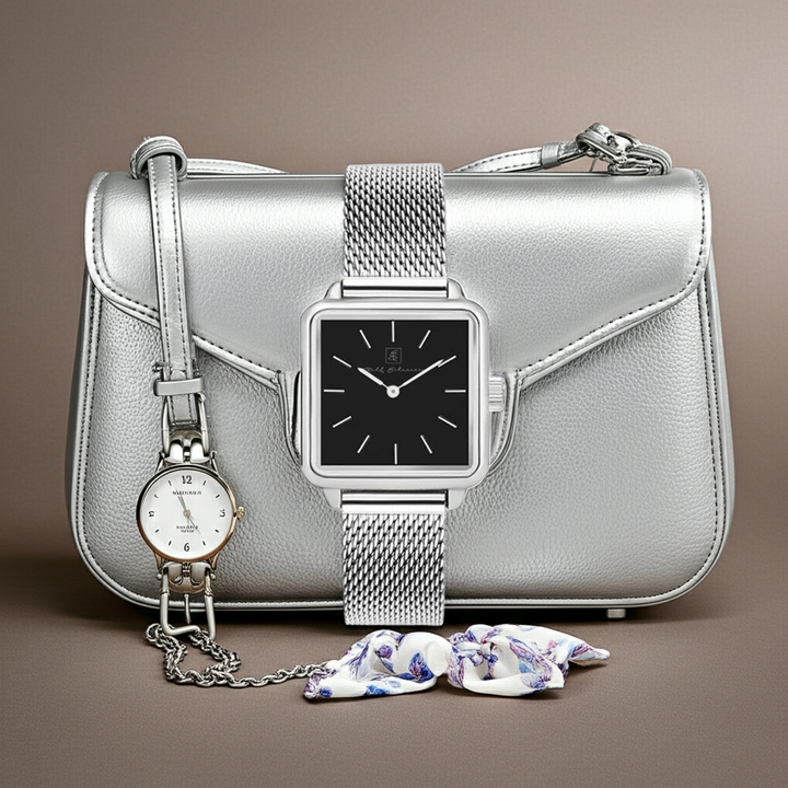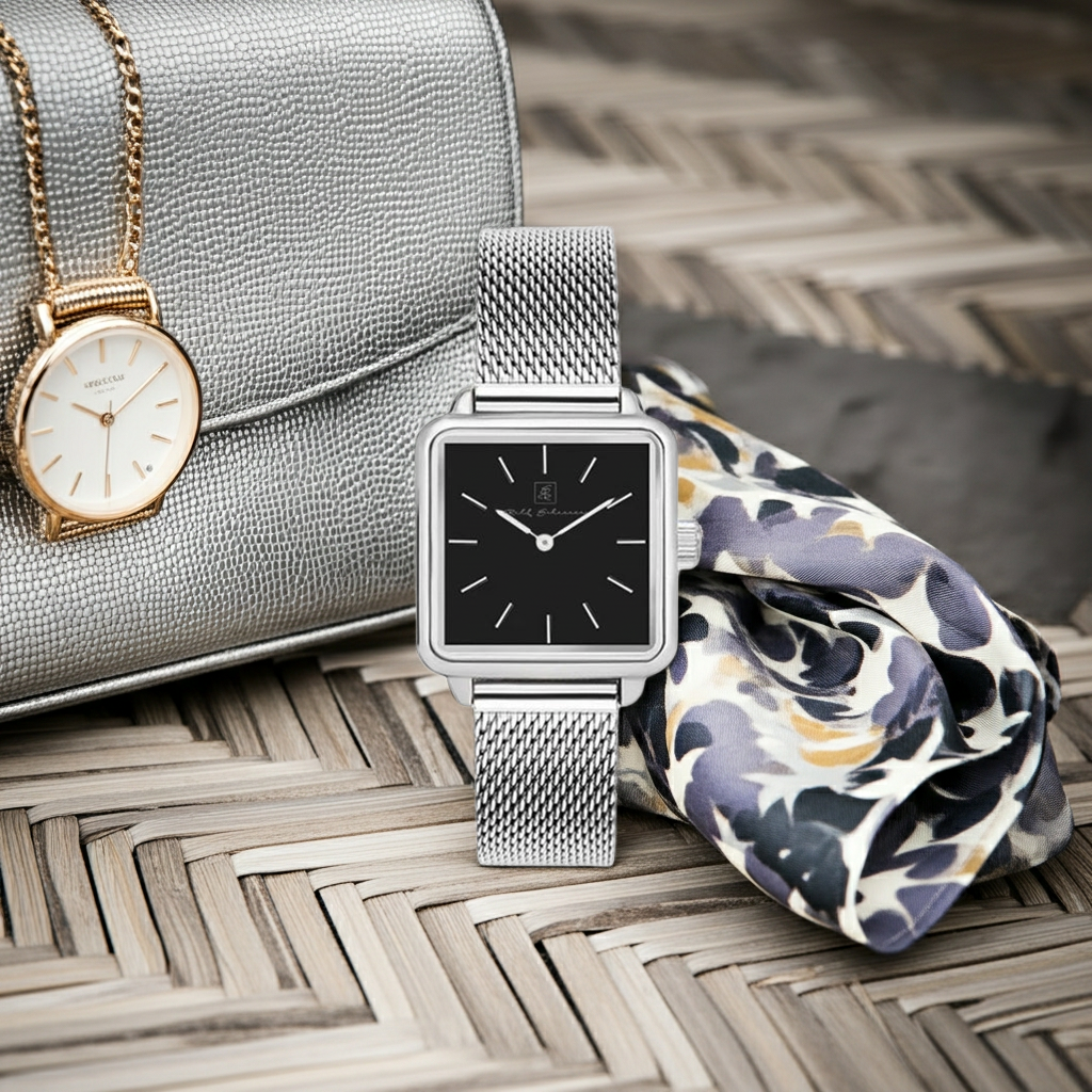 Zeitlose Eleganz: Damenuhr in Silber viereckig Mesh mit schwarzem Ziffernblatt