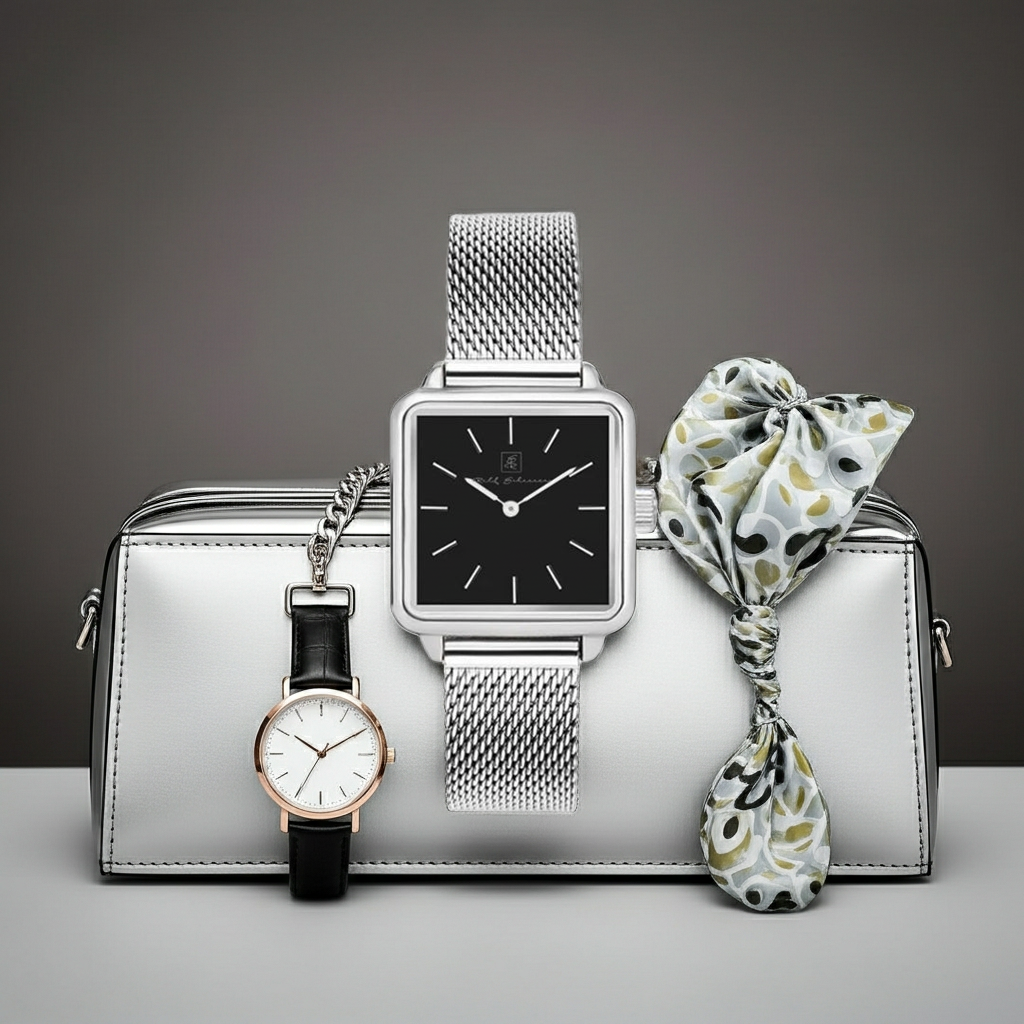 Die Damenuhr in Silber viereckig Mesh mit schwarzem Ziffernblatt ist ein elegantes Accessoire, das durch seine klare Linienführung und moderne Optik besticht. Das viereckige Gehäuse in Silber verleiht der Uhr ein markantes, zeitgemäßes Design, das sowohl schlicht als auch raffiniert wirkt. In Kombination mit dem tiefschwarzen Ziffernblatt entsteht ein harmonischer Kontrast, der für ein edles und minimalistisches Gesamtbild sorgt. Das fein gearbeitete Mesh-Armband in Silber ergänzt das Design perfekt und sorgt für einen dezenten Glanz, der die Uhr zum Blickfang macht.