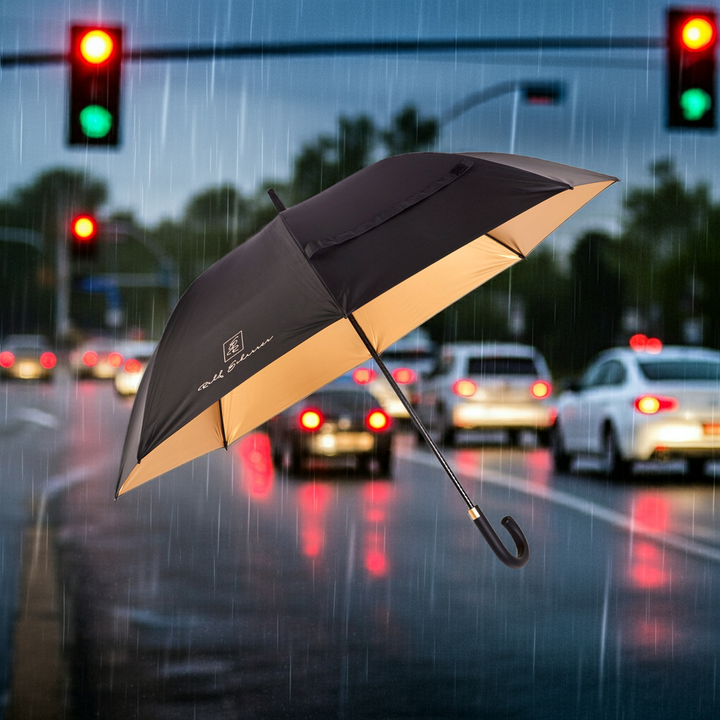 Schwarz-goldener Golfregenschirm, doppelt bespannt mit Fiebergriff und automatischer Öffnungsfunktion.