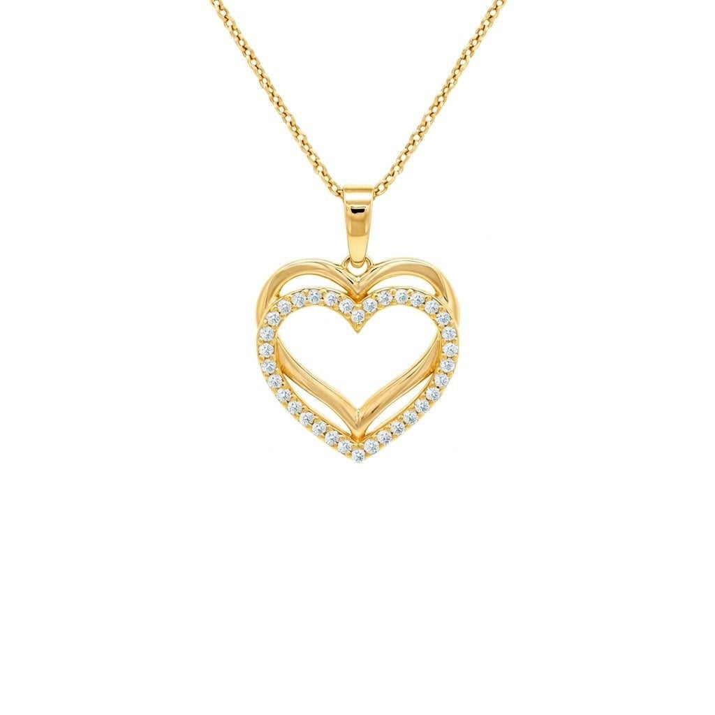 Gelbvergoldete Herz- Halskette mit weißen Zirkonia- Steinen – romantischer Anhänger mit Ankerkette für Damen