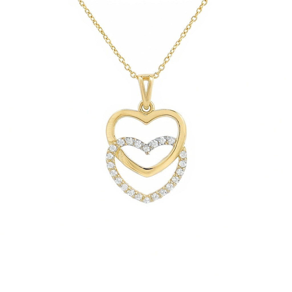 Luxuriöser Doppel-Herzen-Anhänger in Silber Gelbvergoldet mit Ankerkette – Weiße Zirkonia