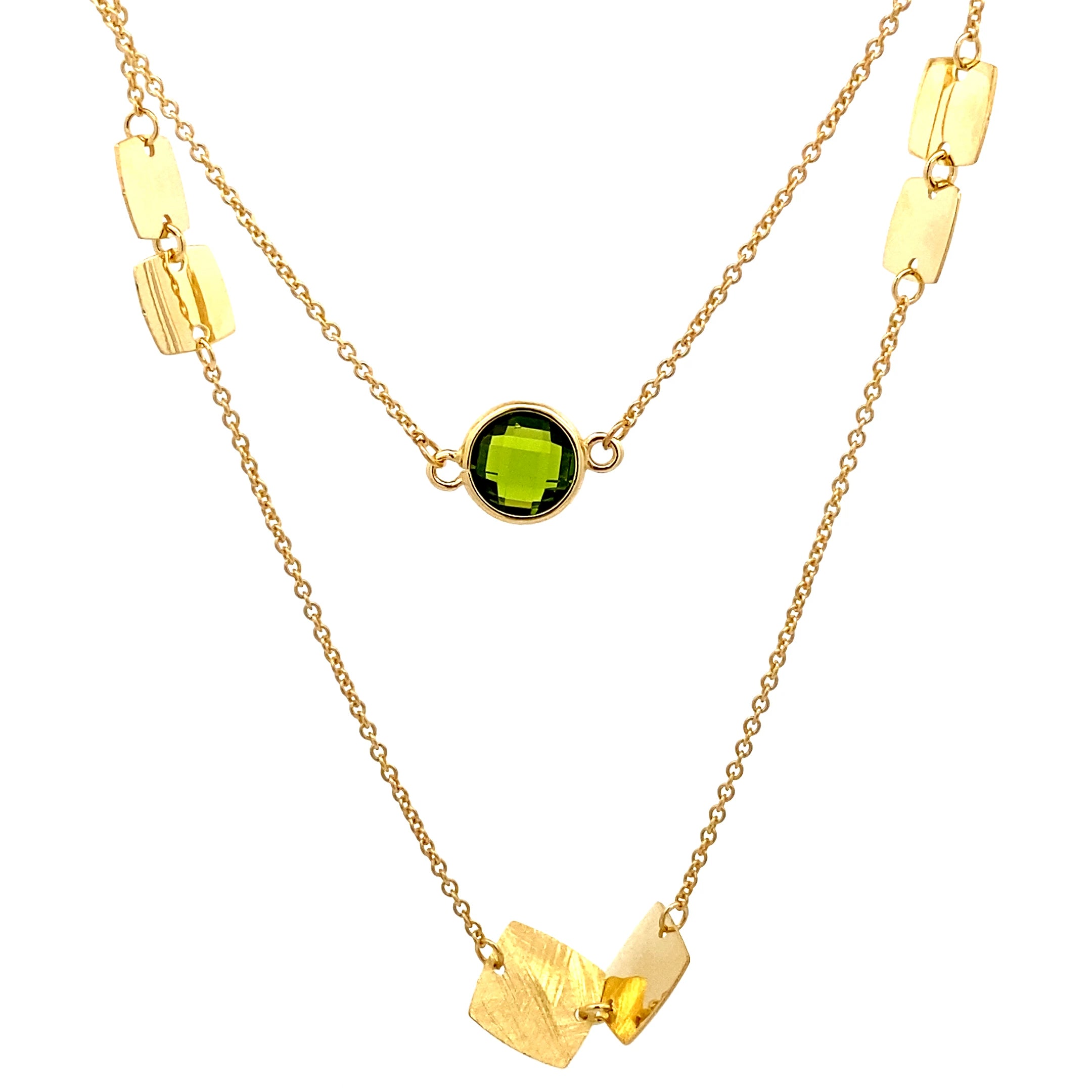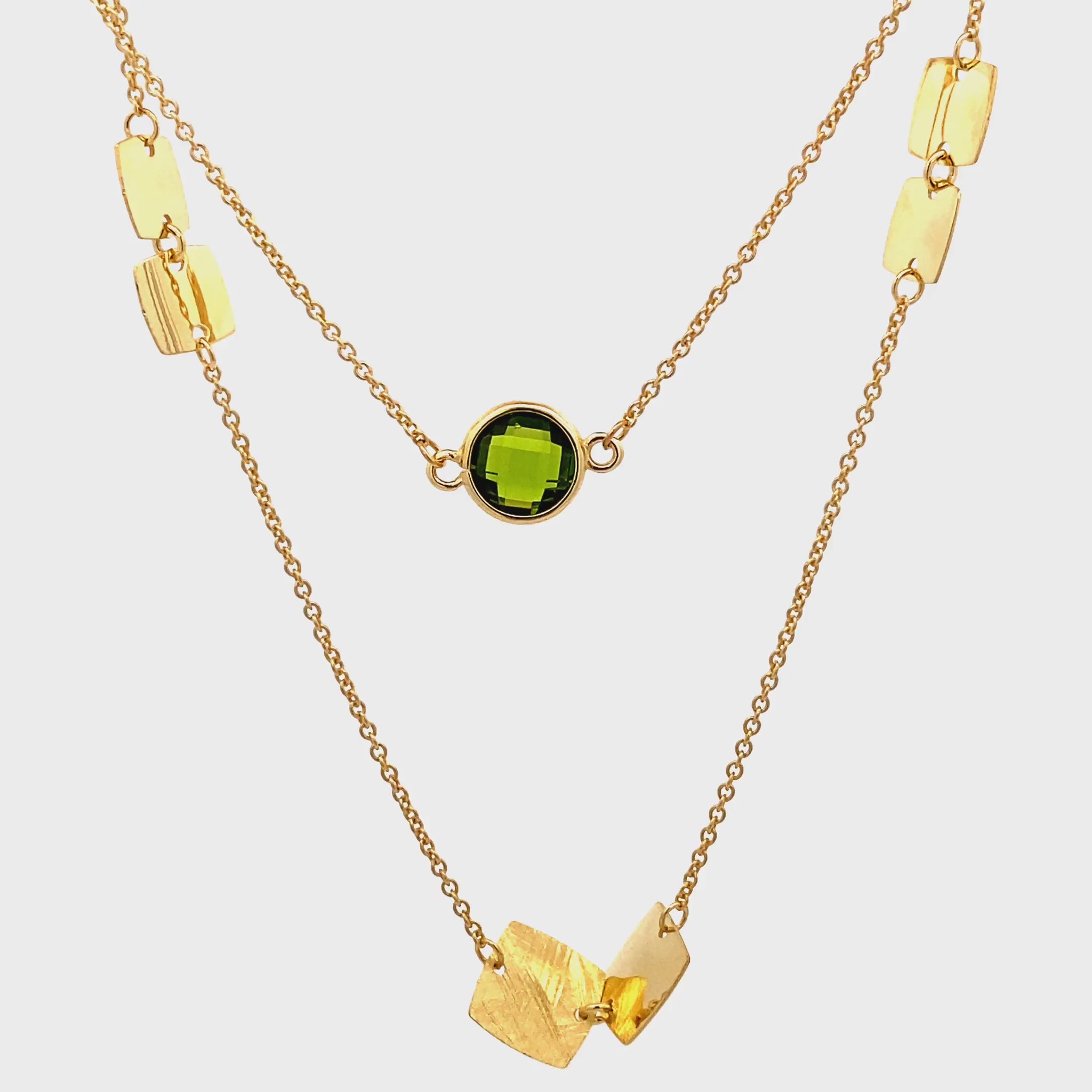 Dieses edle Collier vereint stilvolle Eleganz mit hochwertiger Verarbeitung. Die eismatten und polierten Viereckelemente sorgen für einen faszinierenden Kontrast und modernen Look. Als Highlight schmückt ein runder, facettierter grüner Peridot das Schmuckstück – ein echter Blickfang für jedes Outfit.