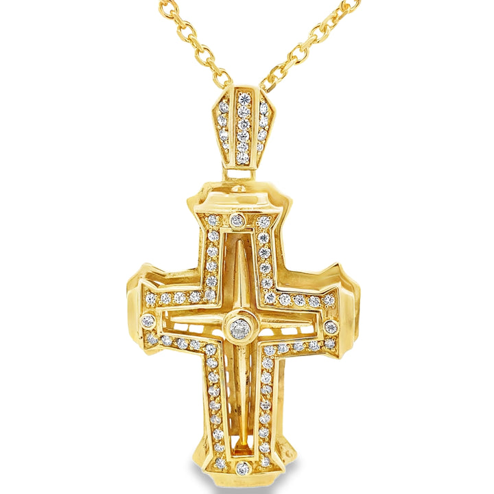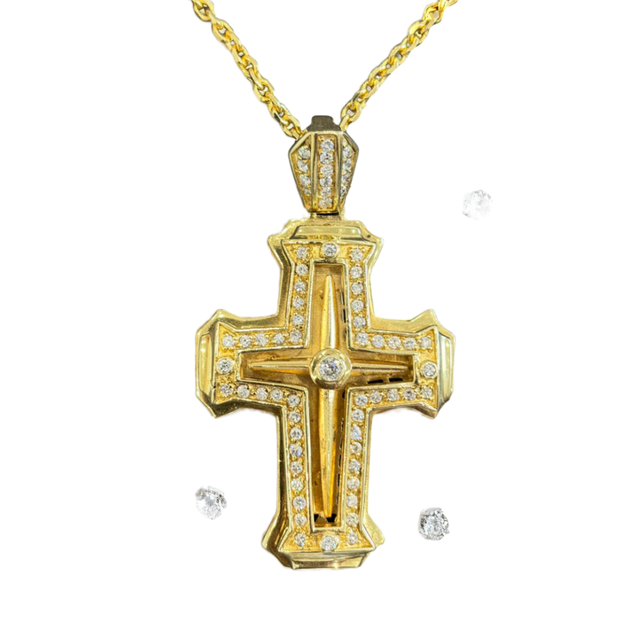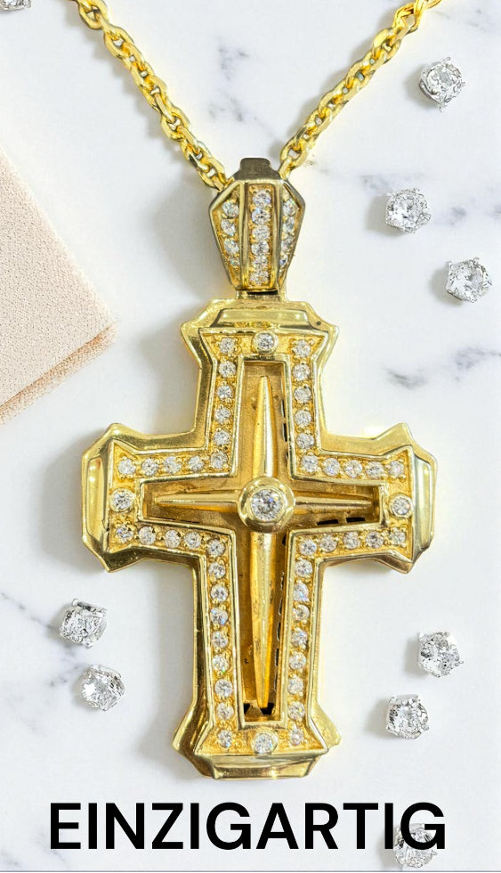 Dieses Schmuckstück ist ein absolutes Einzelstück und verkörpert zeitlose Eleganz in eindrucksvoller Größe. Der plastische Kreuz-Anhänger ist aus hochwertigem Silber gefertigt und aufwendig gelbvergoldet, wodurch er einen warmen, luxuriösen Glanz erhält. Die edle Form wird durch präzise gefasste, weiße Zirkoniasteine veredelt, die dem Kreuz eine strahlende Brillanz verleihen.