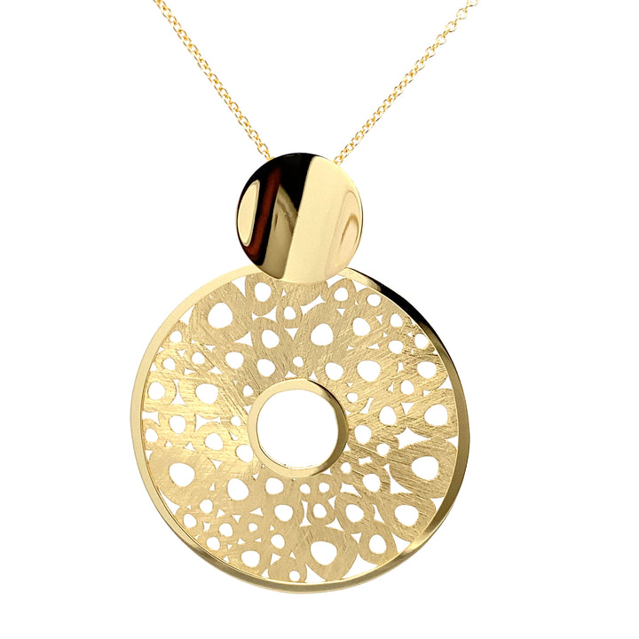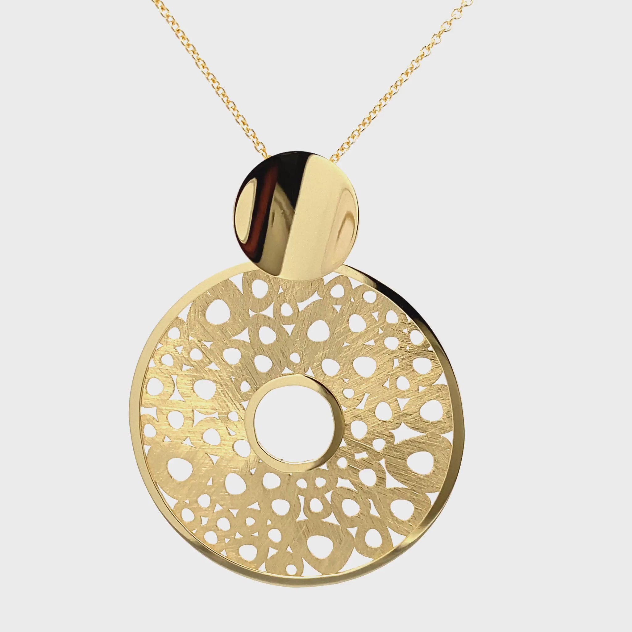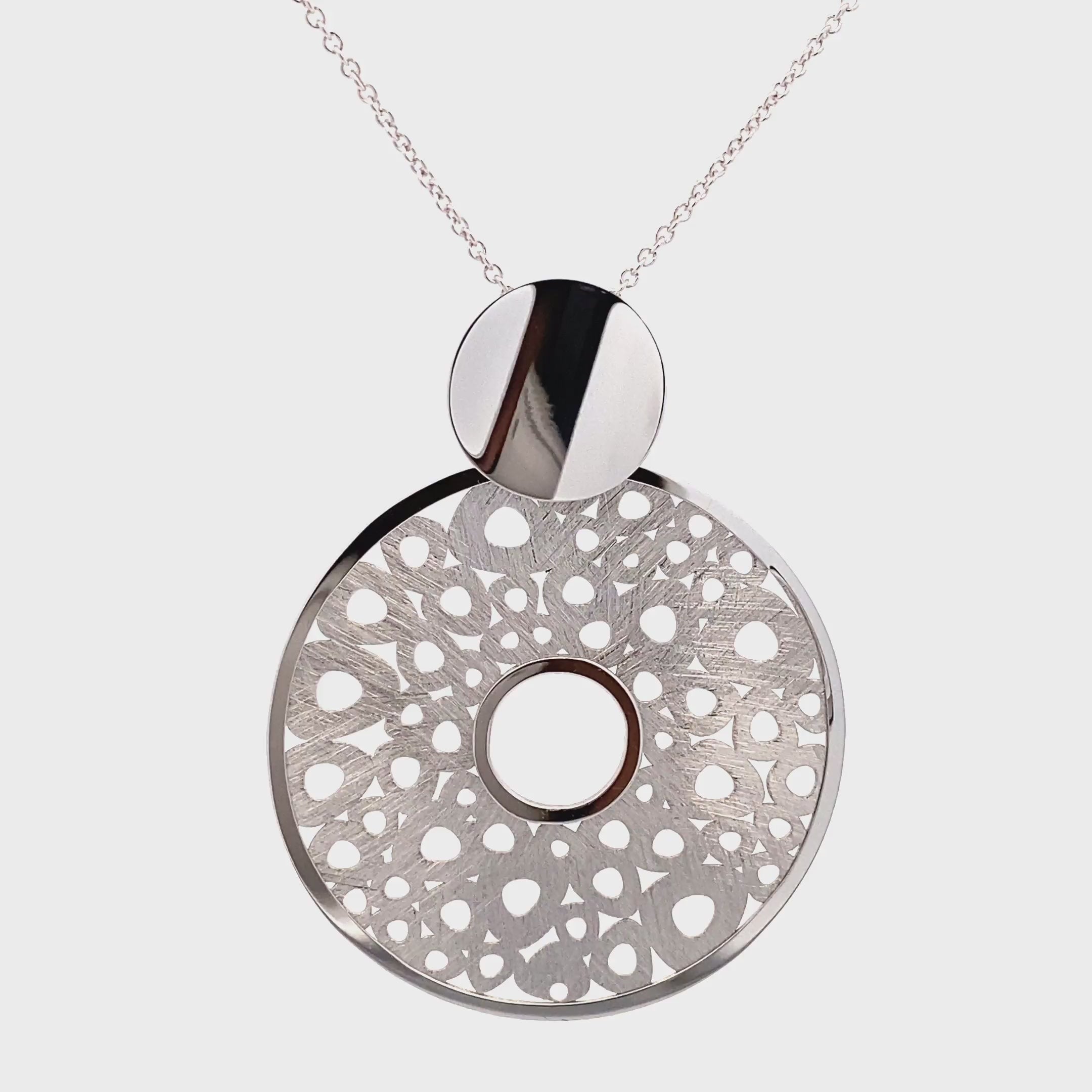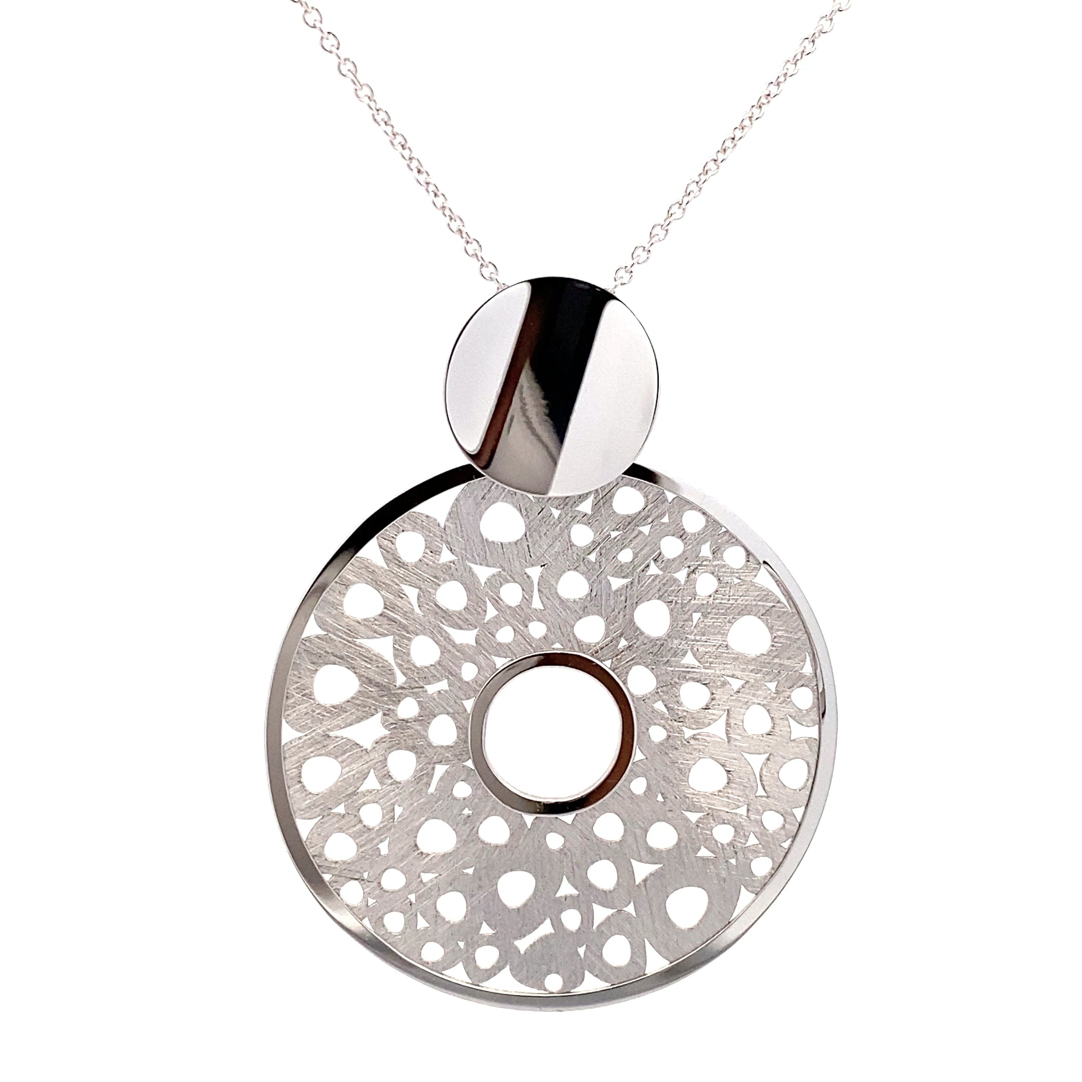 Dieses stilvolle Collier für Damen begeistert mit einer runden Scheibe, die durch ihr feines Lochmuster zu einem echten Blickfang wird. In gelbvergoldeter oder rhodinierter Silber- Ausführung erhältlich, vereint der Schmuck modernen Chic mit zeitloser Eleganz. Die Oberfläche kombiniert eismatte und polierte Elemente und sorgt so für ein spannendes Spiel von Licht und Struktur.
