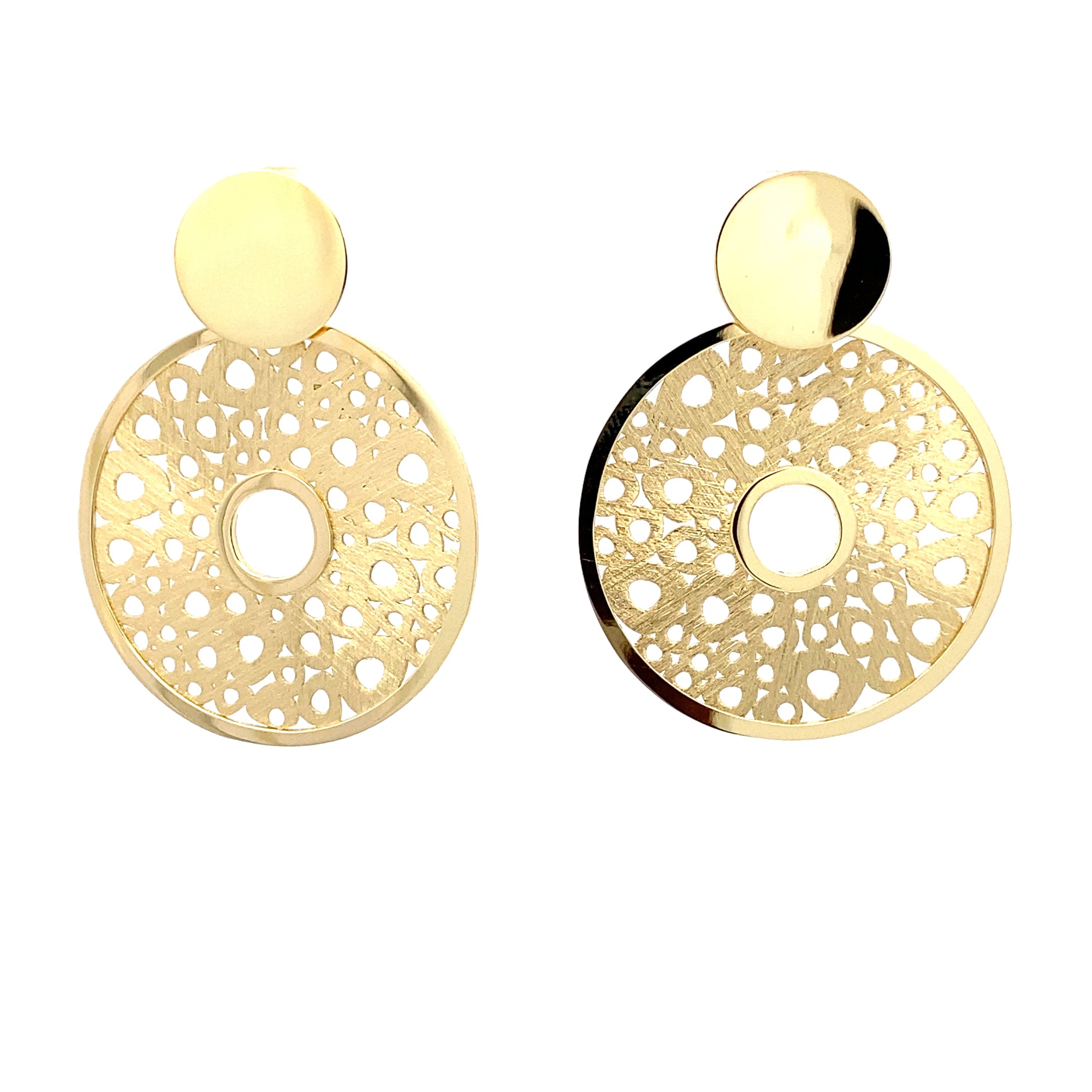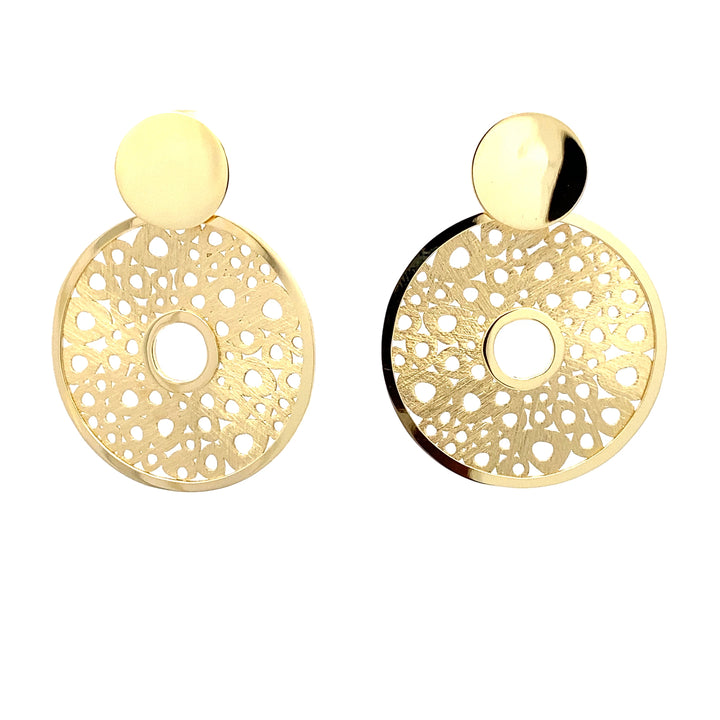 Exquisite Ohranhänger sind ein modisches Highlight, das Eleganz und modernen Chic perfekt vereint. Diese runden Anhänger überzeugen mit ihrem filigranen Lochmuster und einer edlen Oberfläche, die je nach Wahl rhodiniert oder gelbvergoldet ist. Die besondere eismatt-polierte Struktur sorgt für einen dezenten Glanz und setzt das Schmuckstück stilvoll in Szene.