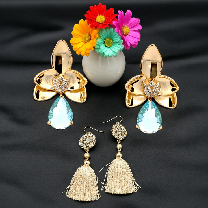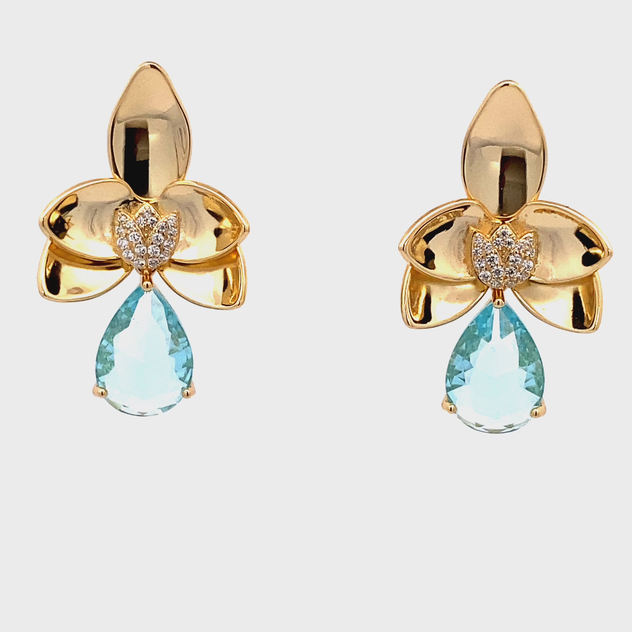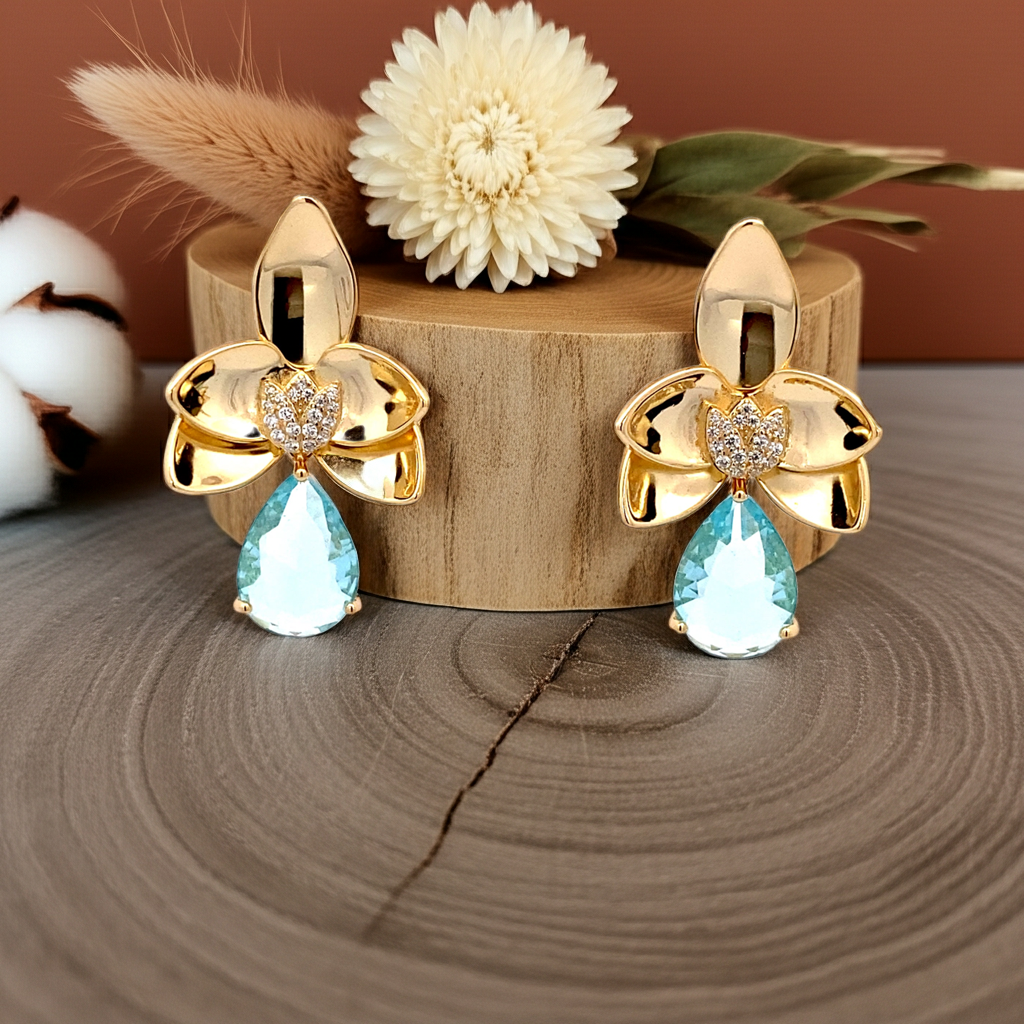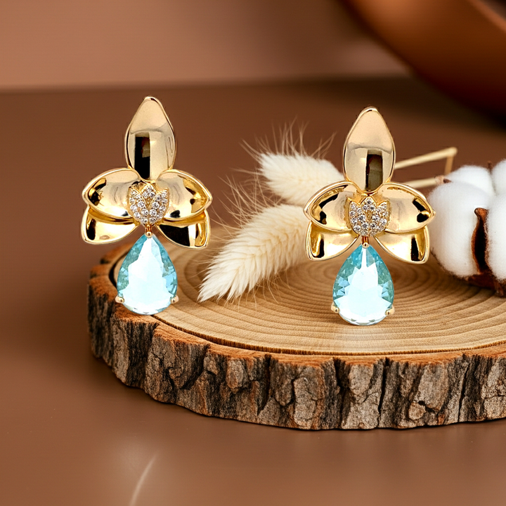 Diese edlen, gelbvergoldeten Silber- Ohrringe vereinen zeitlose Eleganz mit verspieltem Design. Das filigrane Blumenmotiv wird durch einen großen, funkelnden weißen Zirkonia-Stein im Zentrum hervorgehoben, während ein facettenreich geschliffener, hellblauer tropfenförmiger Zirkonia-Stein den Look harmonisch abrundet.