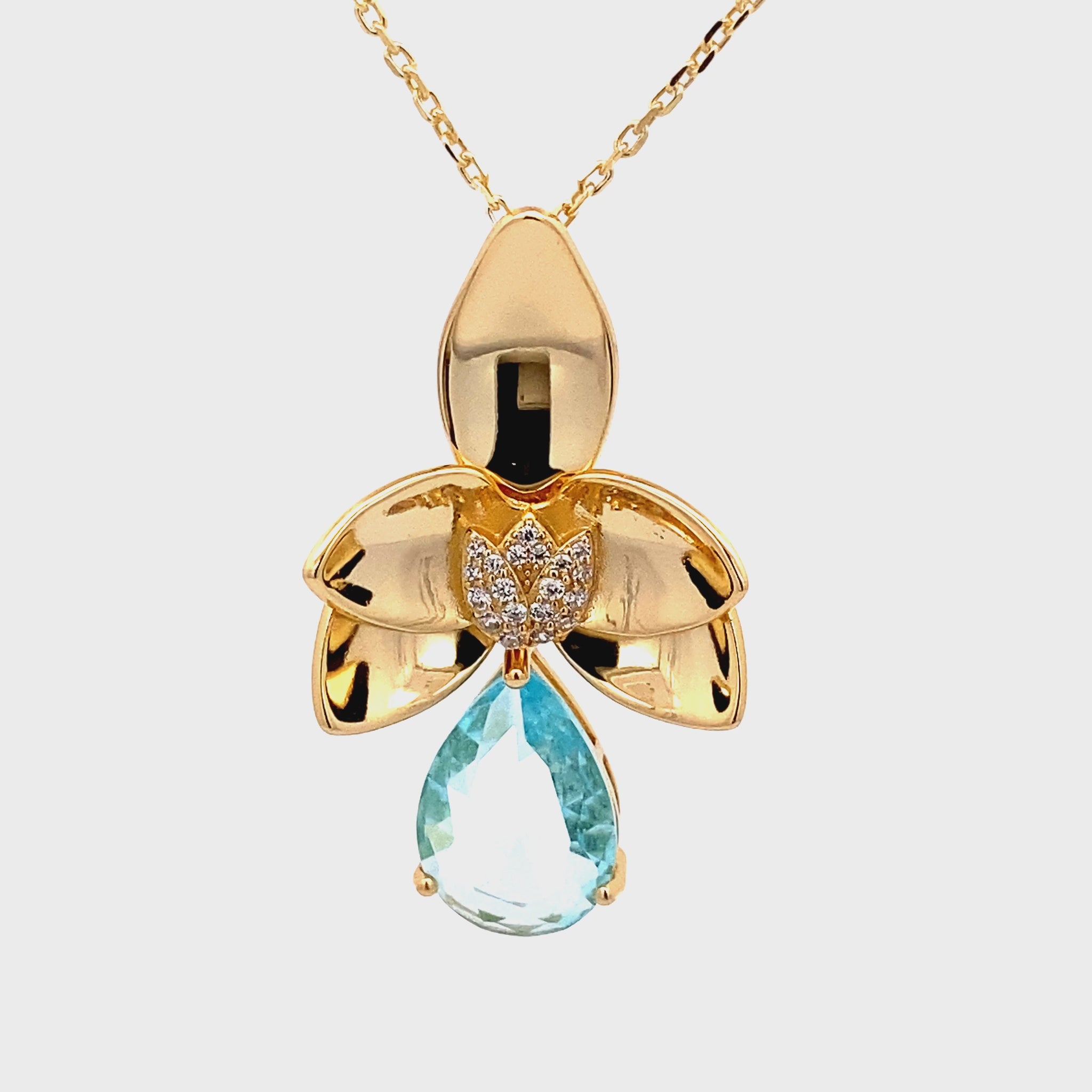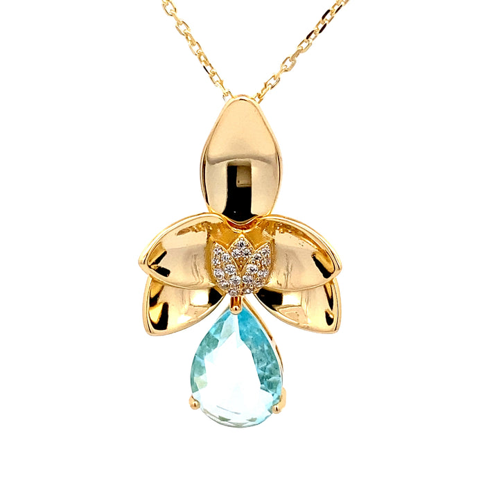 Dieser Schmuckanhänger symbolisiert Feminität, Frische und Eleganz. Der hellblaue Zirkonia-Tropfen erinnert an glitzerndes Wasser und sorgt für eine edle Farbwirkung, während die Kombination mit der fein gearbeiteten Blüte Leichtigkeit und Natürlichkeit ausstrahlt. Perfekt geeignet sowohl für den Alltag als auch für festliche Anlässe. Mit diesem gelbvergoldeten Silber- Blumen-Anhänger mit Kette trägst du ein Schmuckstück, das klassisch und modern zugleich wirkt. Der farbintensive Zirkonia in Tropfenform macht jedes Outfit zum Blickfang und verleiht einen Hauch von Luxus.