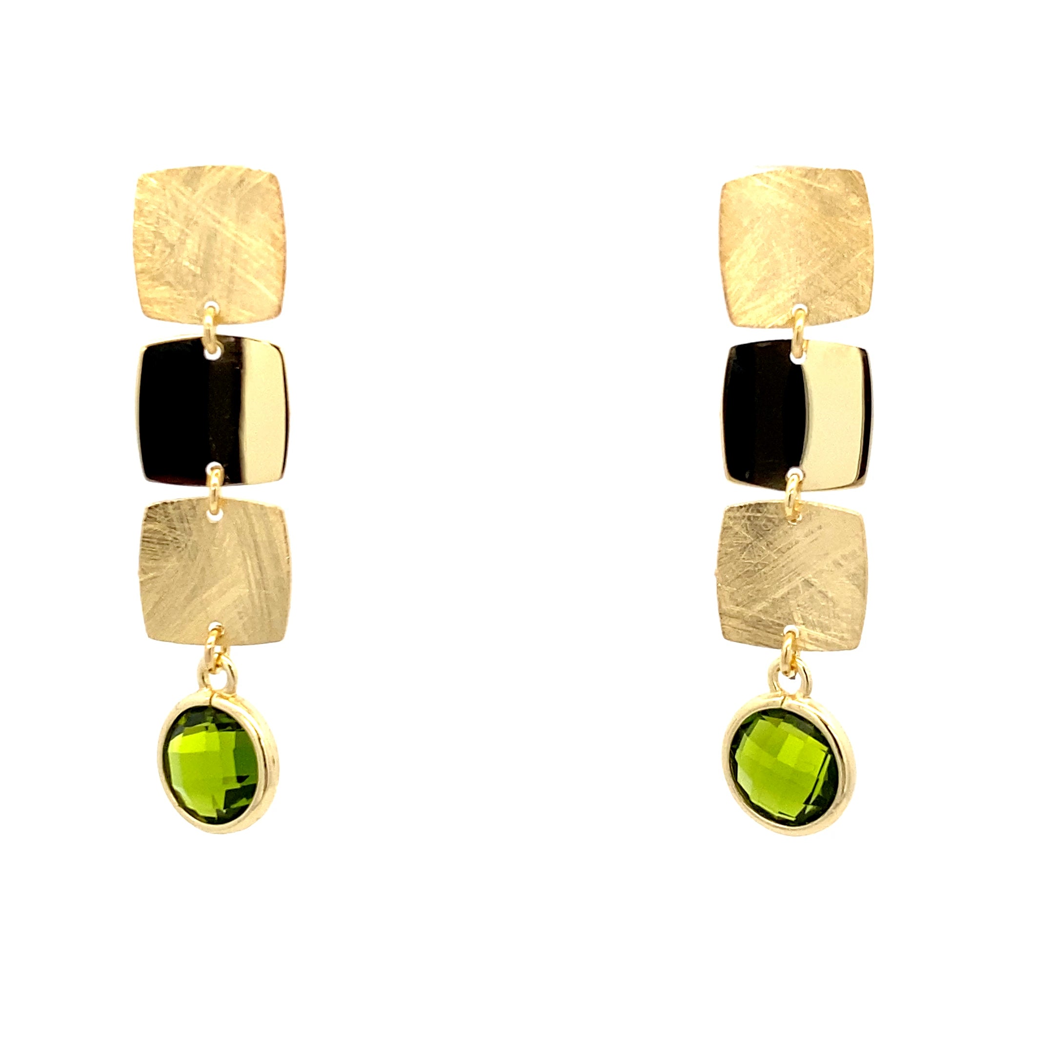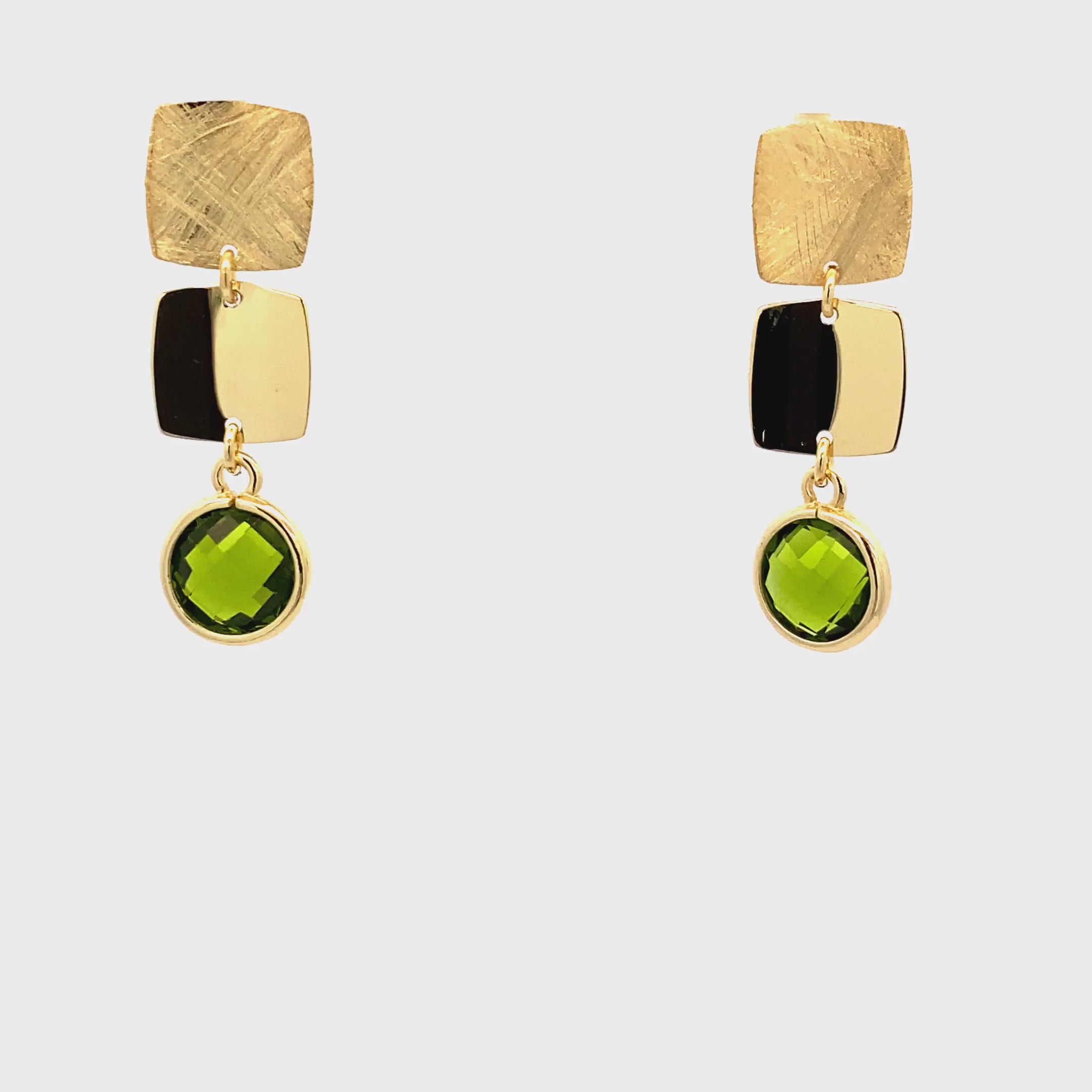 Entdecke die eleganten Ohrhänger mit grünen, facettierten und gefassten Peridoten – ein Highlight für jede Schmuckliebhaberin. Die Ohrhänger sind in zwei Varianten erhältlich: mit 2 eckigen oder 3 eckigen Elementen, jeweils in einem modernen Mix aus eismattiertem und poliertem Finish für zeitlose Eleganz.