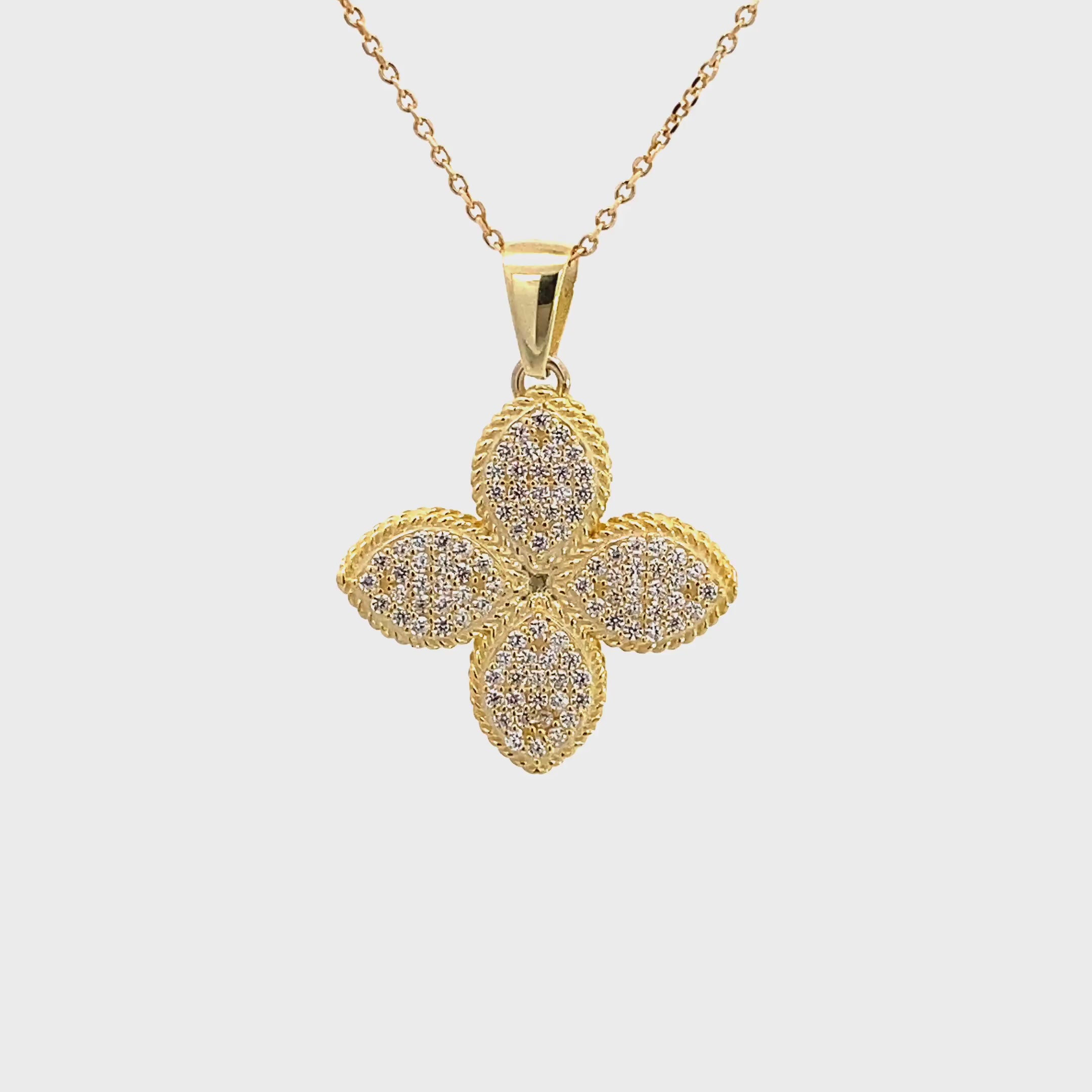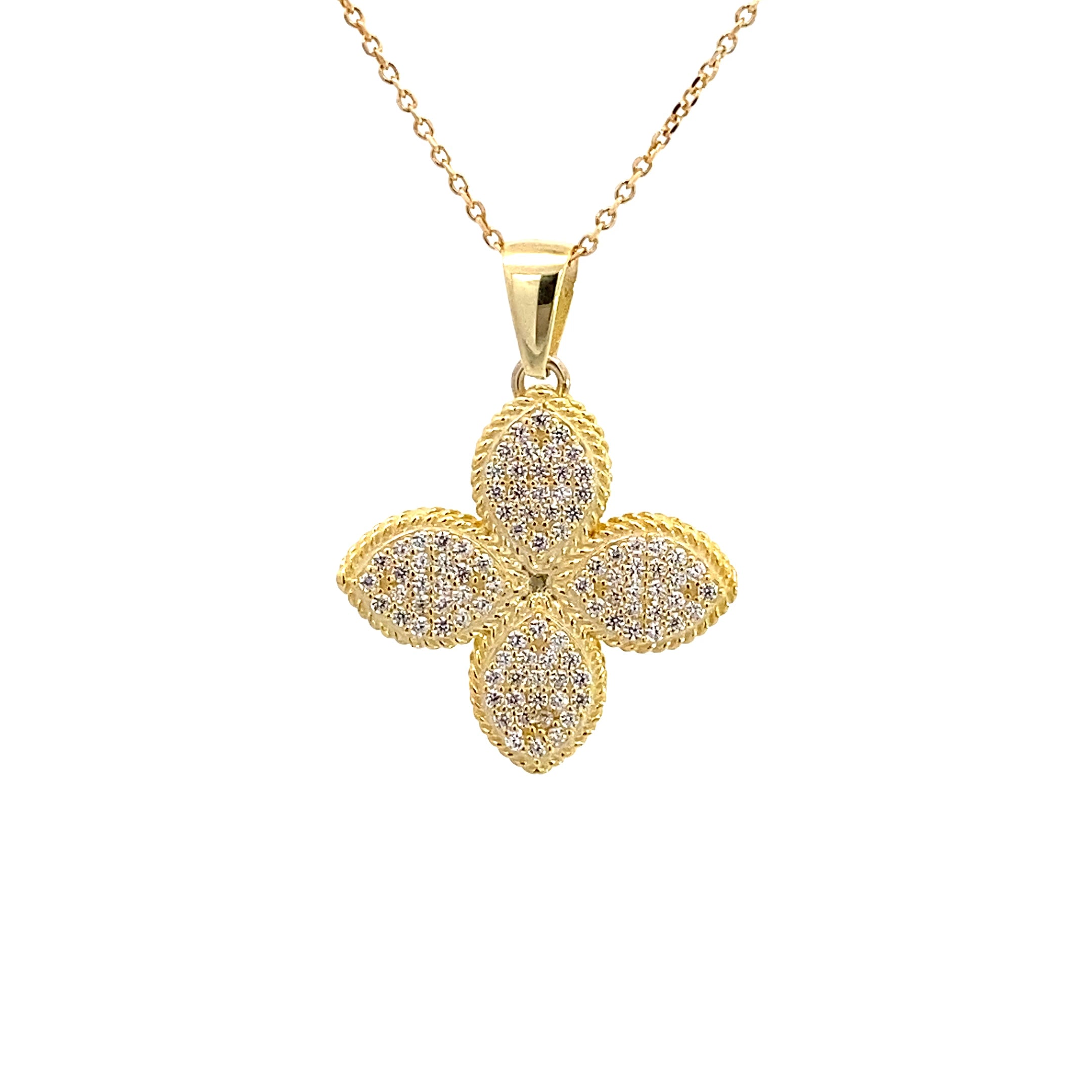 Exklusives Collier im Blumen-Design: Dieses hochwertige Schmuckstück begeistert mit einem stilvollen Anhänger in floraler Form, besetzt mit einem großen weißen Zirkonia-Stein im Zentrum. Umrahmt wird das funkelnde Highlight von zahlreichen kleinen Zirkonia-Steinen, die für ein intensives Glitzern sorgen. Durch die edle Gelbvergoldung des 925 Silber erhält das Collier eine warme Ausstrahlung, die perfekt zu eleganten wie auch modernen Outfits passt.