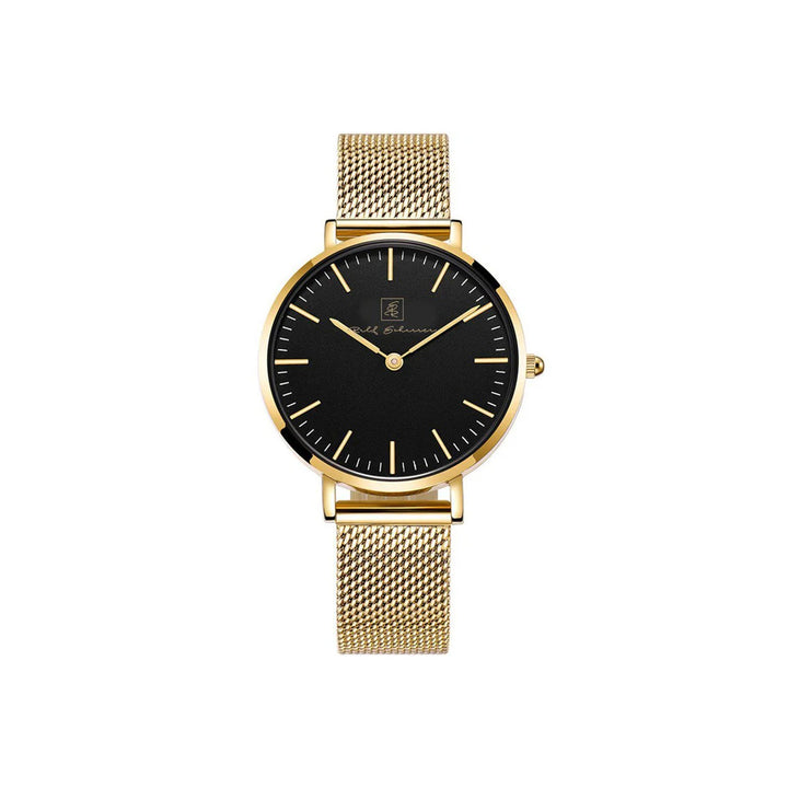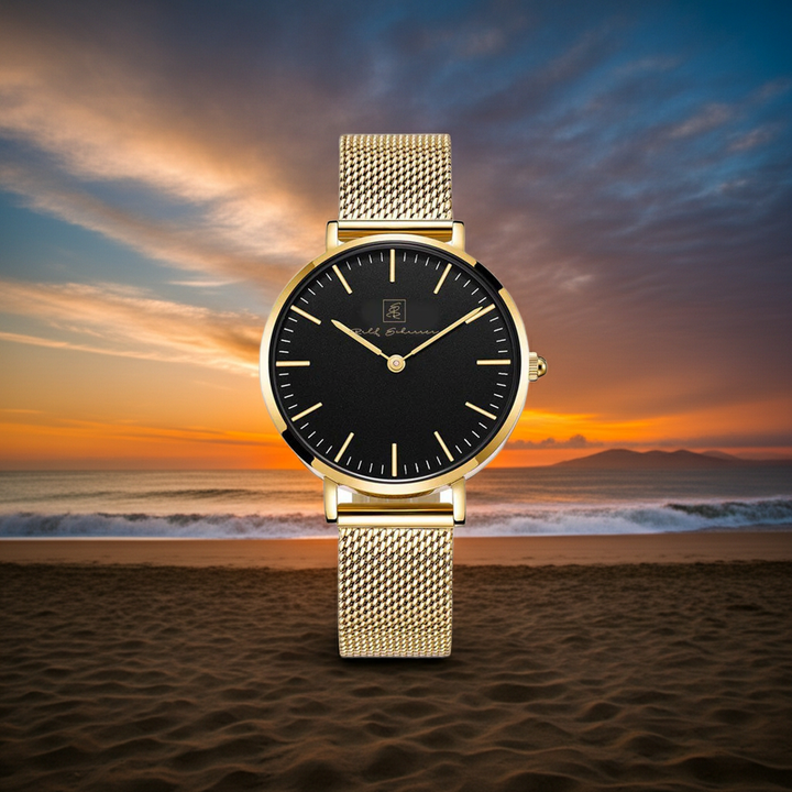 Gehäusebreite: 32 mm, Gehäusedicke: 6 mm, Zifferblatt Sunshine Schwarz Armbandbreite: 18mm, Armbandfarbe: Gold Uhrwerk: Japanisches Quarzuhrwerk; Material: 2x beschichteter Edelstahl Armbandtyp: Milanese mit Sicherheitsverschluss, Auswechselbares Armband: Ja mit Quick Release Wasserabweisend: bis 3ATM
