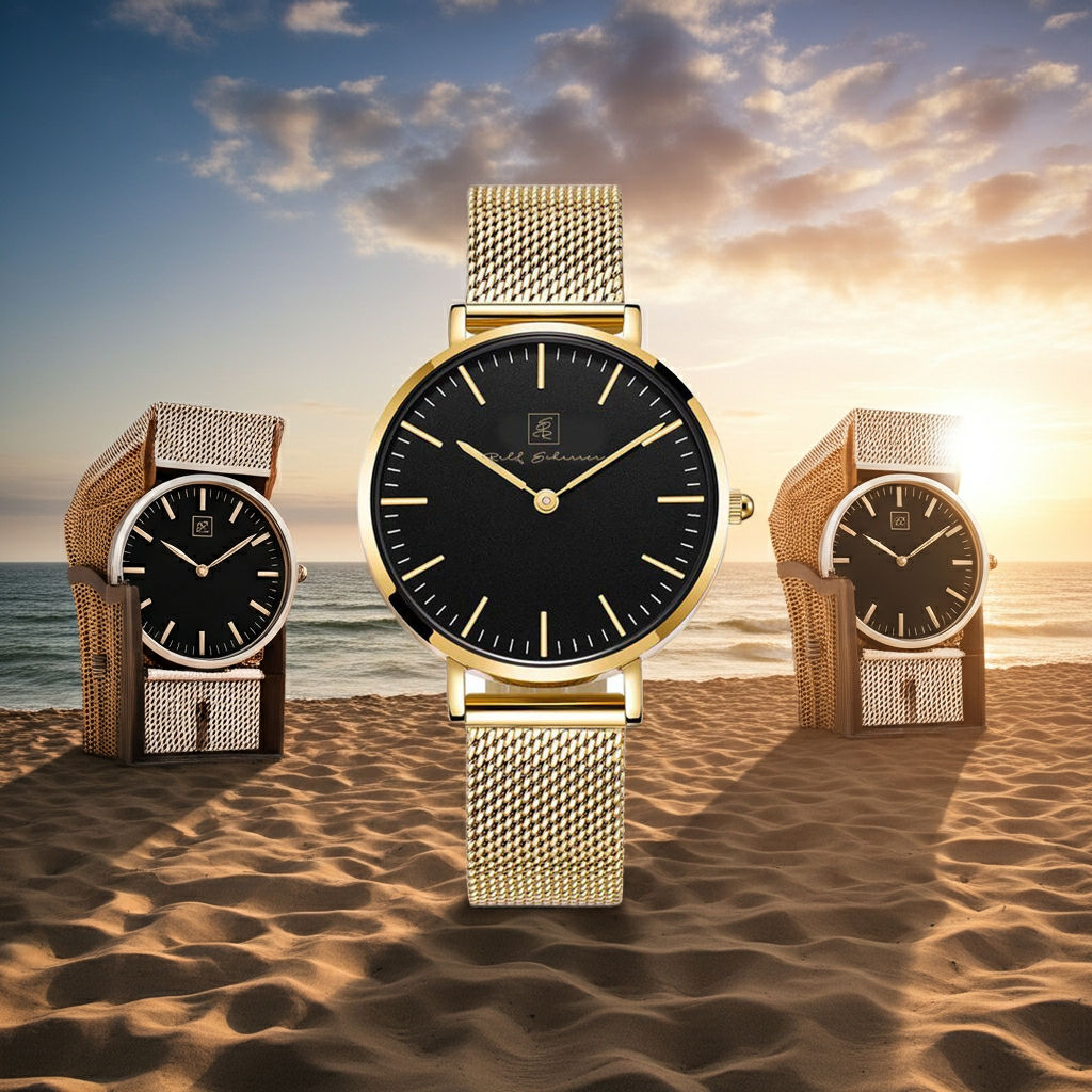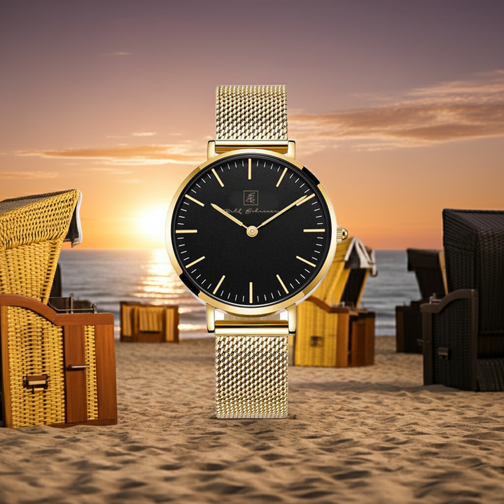 Gönn Dir Glanz! “Sylt” 32 mm in Goldfarben mit schwarzem Ziffernblatt