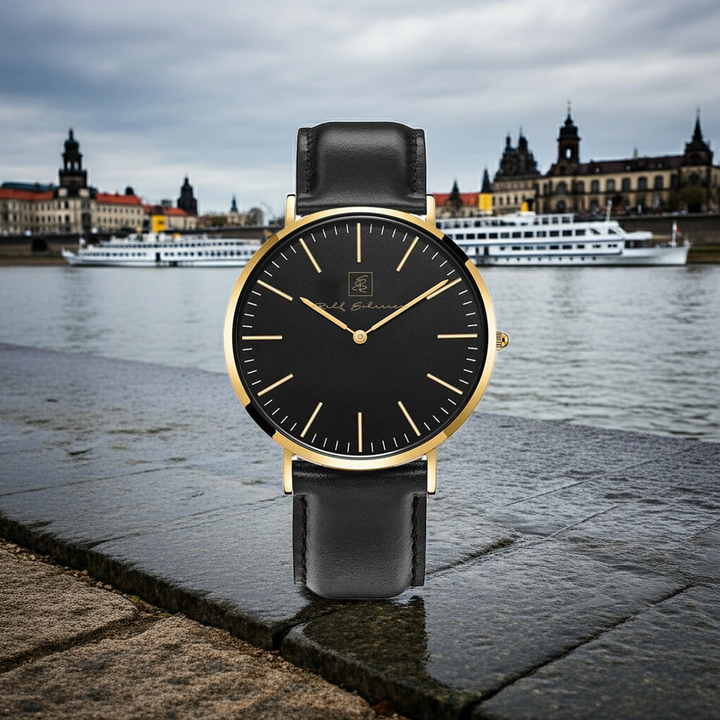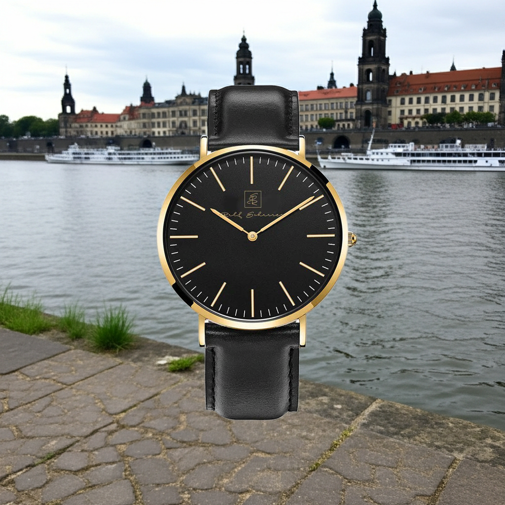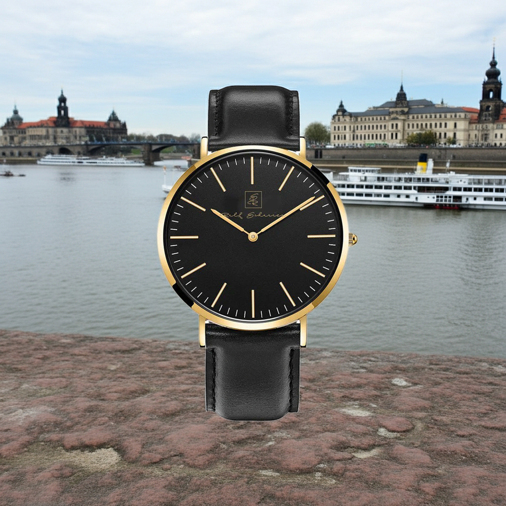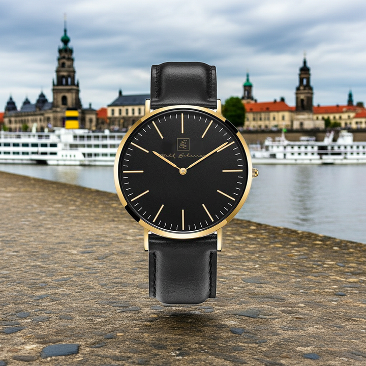 Leicht. Flach. Zeitlos! Unisex- Armbanduhr “Dresden” 38 mm mit schwarzem Ziffernblatt und Lederarmband