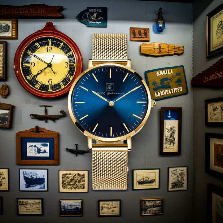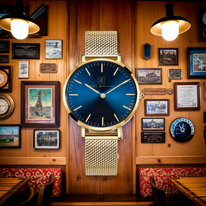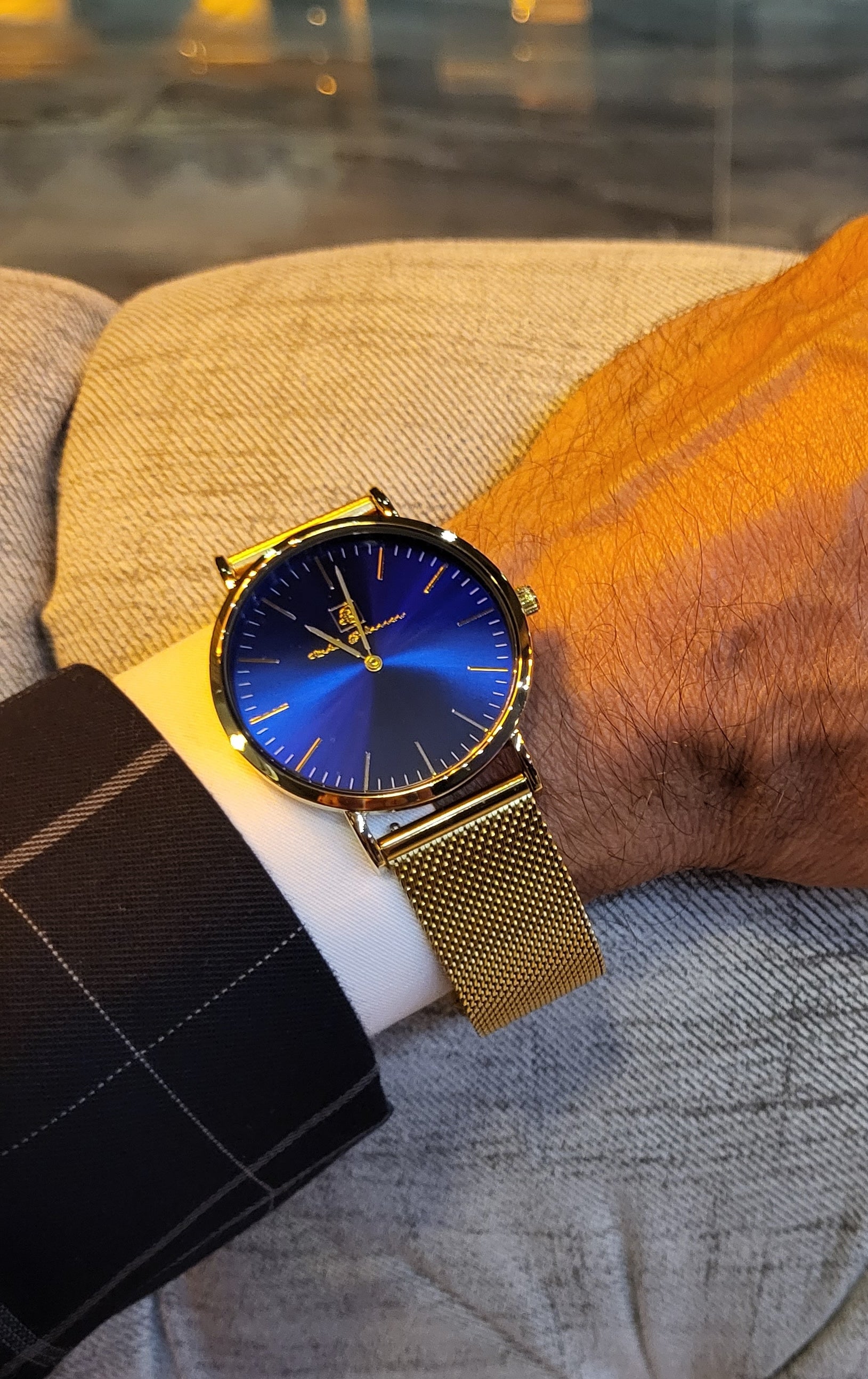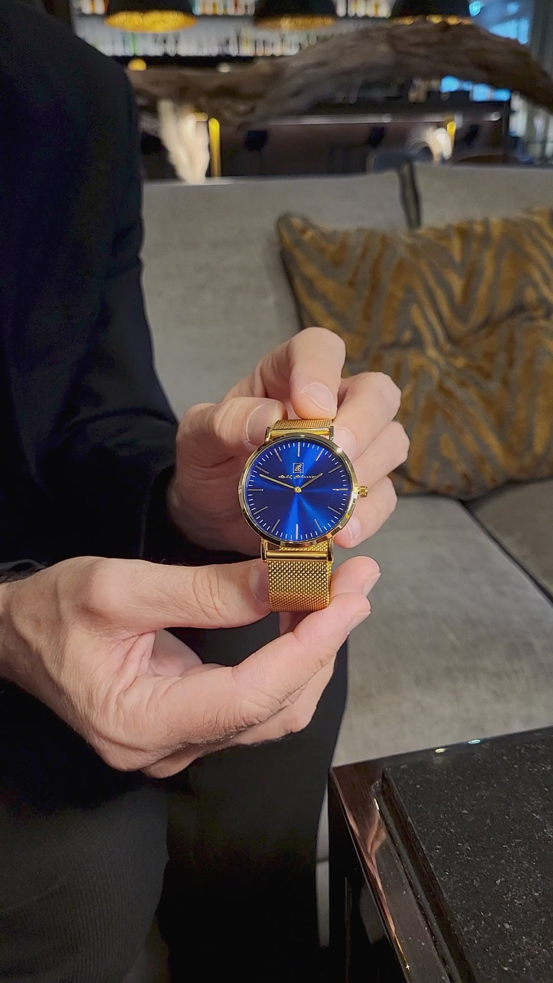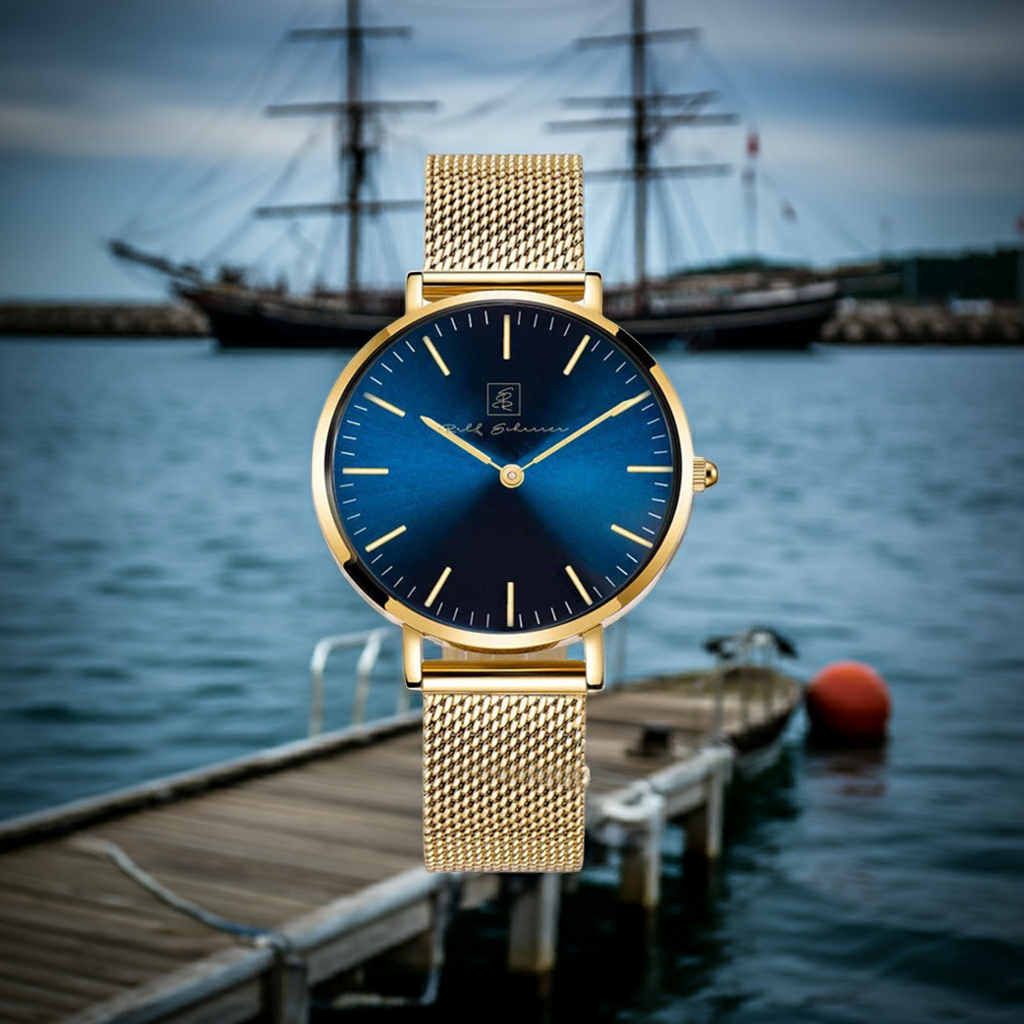 Diese Unisex- Uhr in Gold mit Milanese Armband und blauem Ziffernblatt beeindruckt durch ihre harmonische Kombination aus luxuriösem Design und kraftvollen Farbakzenten. Das feine, goldene Milanese Armband verleiht der Uhr eine elegante und moderne Optik, während das tiefblaue Ziffernblatt einen ausdrucksstarken Kontrast schafft. Die goldenen Zeiger und Markierungen auf dem Ziffernblatt fügen sich nahtlos in das edle Gesamtbild ein und machen die Uhr zu einem wahren Blickfang. Perfekt für Frauen, die Wert auf ein stilvolles Accessoire legen, das sowohl im Alltag als auch zu besonderen Anlässen getragen werden kann.